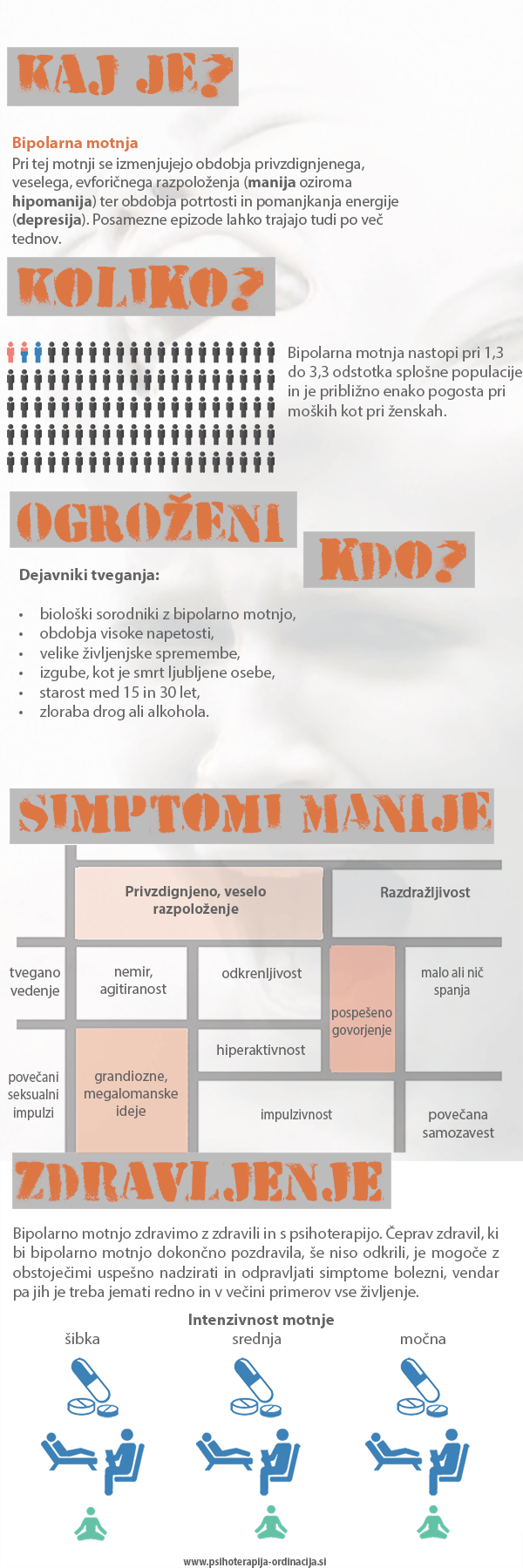 Pri bipolarni motnji se izmenjujejo obdobja depresije in manije ali hipomanije.